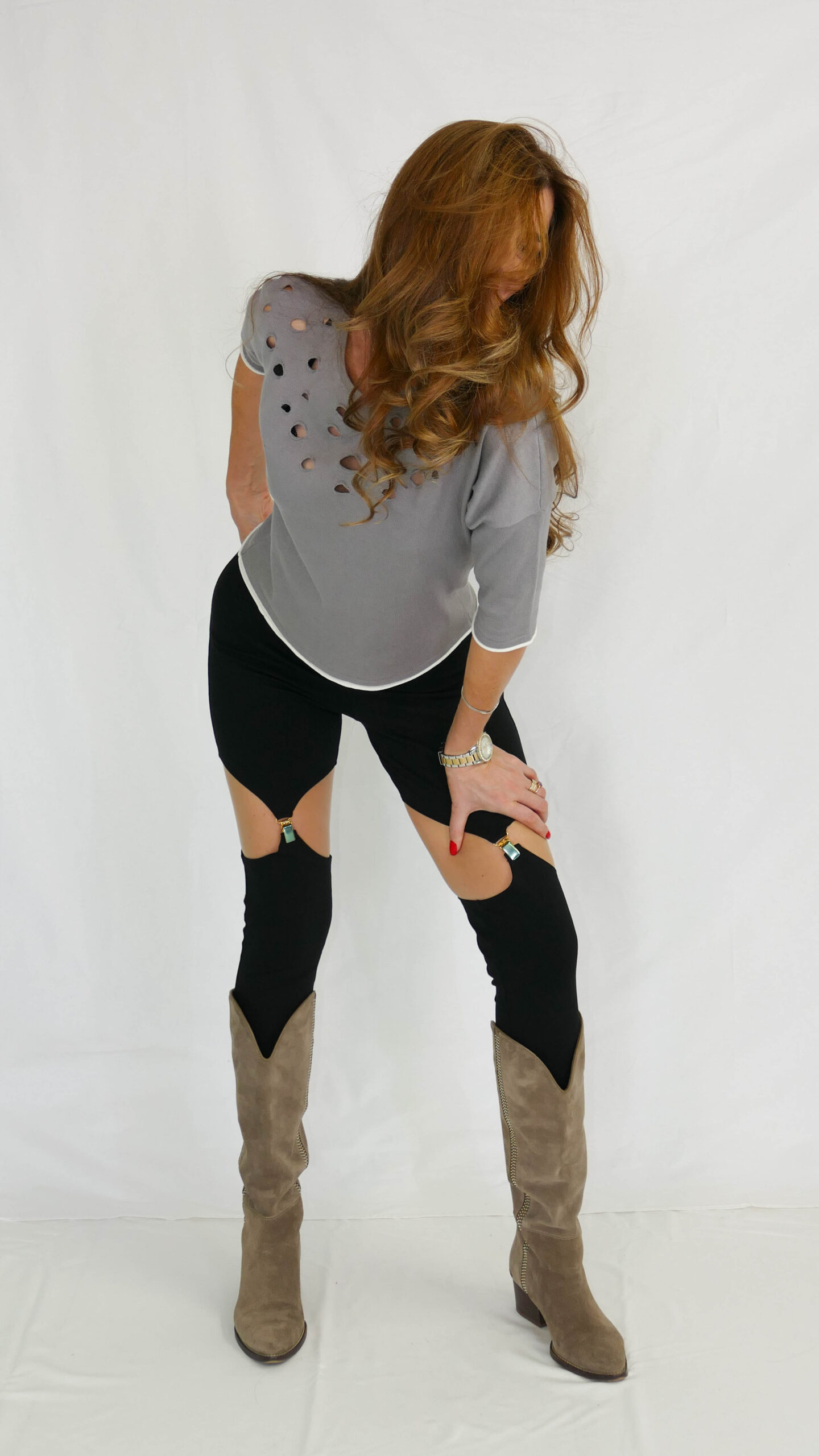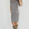 Compleul de culoare gri este format din fustă midi și bluză cu elemente decupate. Datorită elasticității materialului, orice tipologie de siluetă este pusă în evidență.