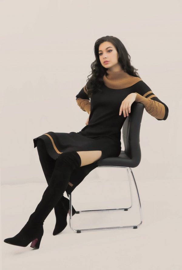 Tricotată din fibre naturale de bumbac, rochia de culoare neagră, cu inserții maro, este ideală pentru zilele ploioase și răcoroase. Tiparul cu crăpătură pe ambele părți laterale îți va pune în valoare picioarele. Datorită structurii lejere nu doar că se potrivește pe orice tipologie de siluetă, dar oferă și confort pe întreaga durată a zilei.